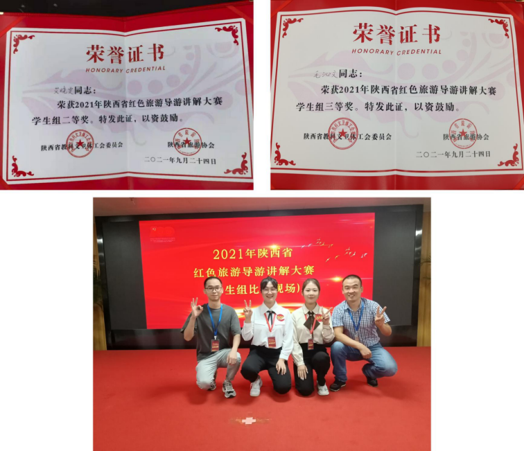 本次比赛公司高度重视,党政一把手全程参与,经过组织动员、选拔、赛前专业指导,历时月余。最终旅游管理系系主任刘智兴老师与青年教师范玉强指导的2020级旅游管理专升本班艾晓雯和2019级旅游管理1班毛沁文两位同学通过现场讲解、红色知识现场问答、才艺展示等环节分别获得2021年陕西省红色旅游导游讲解大赛(员工组)二等奖和三等奖。