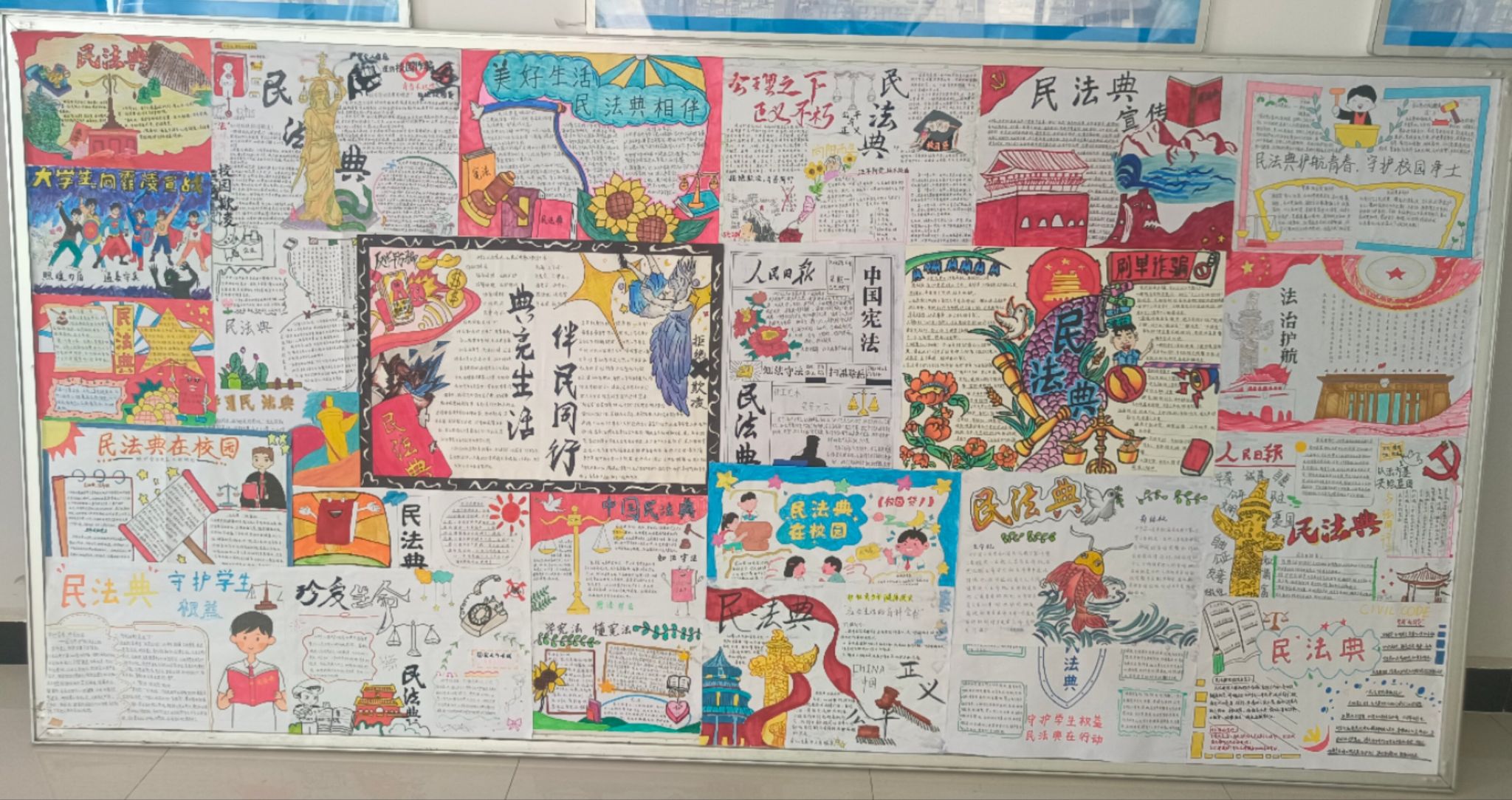 在活动形式与内容上,以全院大一至大三员工为主体,以宿舍为基本单位,开展了民法典主题手抄报创作活动。活动聚焦民法典中生命权、身体权、健康权等核心内容,并紧密结合防范校园欺凌、“校园贷”等校园常见法律风险。同学们积极参与,充分发挥创意,将法律知识与艺术创作相融合,用图文并茂、生动鲜活的手抄报作品,深入阐释了民法典在维护员工合法权益中的重要作用。此次活动共收到64份主题手抄报,这些作品内容丰富、设计精美,兼具思想性与艺术性,展现出同学们对民法典的深刻理解。