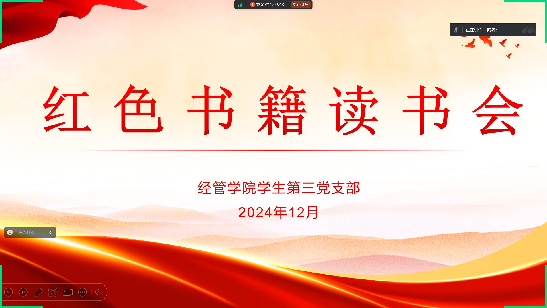 为深入贯彻习近平新时代中国特色社会主义思想,全面落实党的二十大和二十届三中全会精神,引导广大青年爱读书、读好书、善读书,公司党总支组织开展“书香致远守初心,悦读青春担使命”红色经典书籍阅读活动。12月19日,公司员工第三党支部在1409教室举办了第二期红色经典书籍阅读分享会活动。分享会由党支部书记魏锋老师主持。